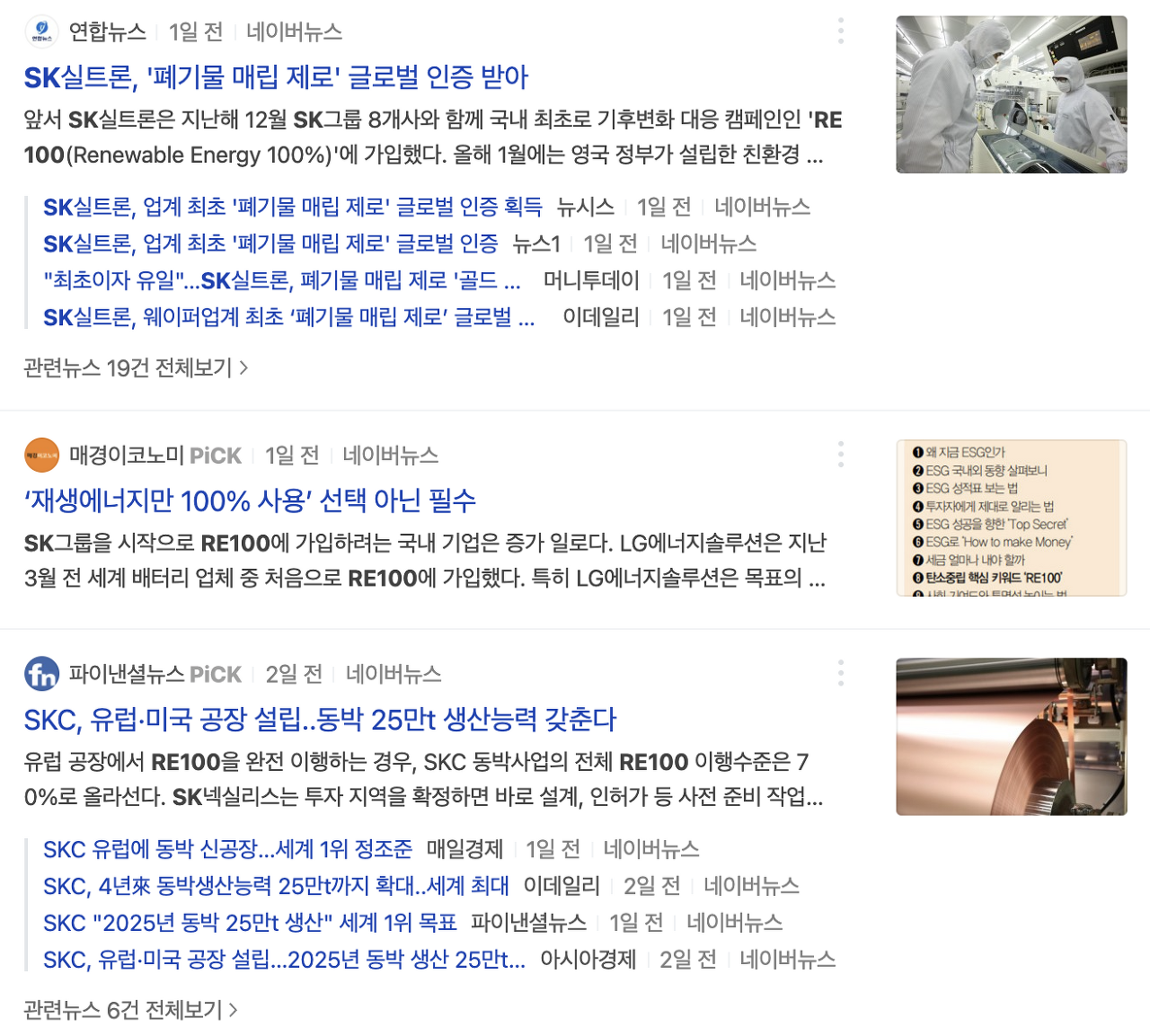 SK그룹 계열사 RE100 이행 관련 기사 모음, 네이버