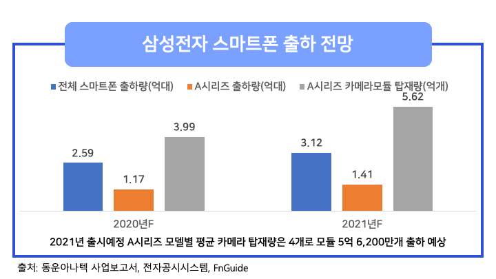 올해는 3억 1천만대의 스마트폰이 출하될 것으로 전망하는데 이 중 1억 4100만대의 A시리즈가 출하하고 A시리즈에 5억 6천만개의 카메라모듈이 출하될 것으로 예상되고 있습니다.