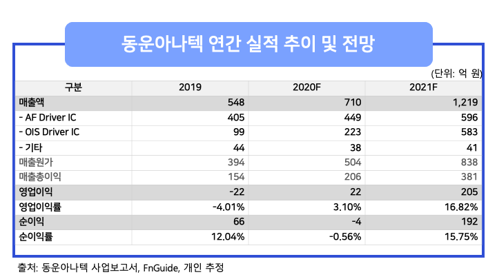 2020년은 OIS Driver IC 매출이 늘면서 전체 710억원이 예상되며, 영업이익은 22억원이 예상되고 있습니다.