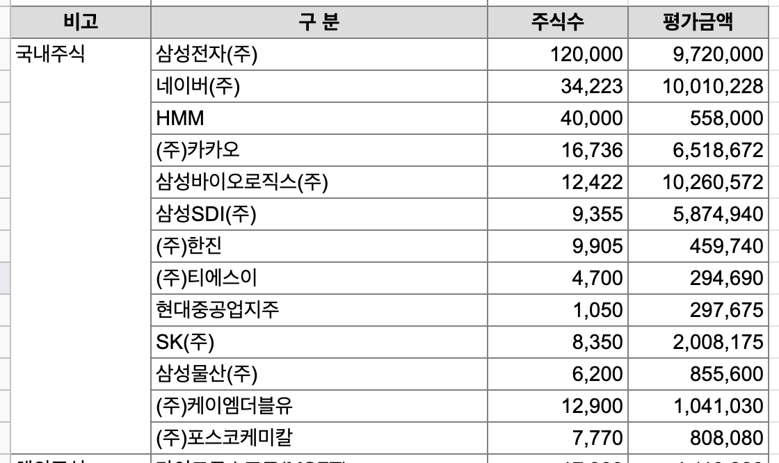 국내 주식으로는 삼성전자 12만 주, 네이버 약 3만 4천 주, HMM 4만 주 등 보유 중이며,