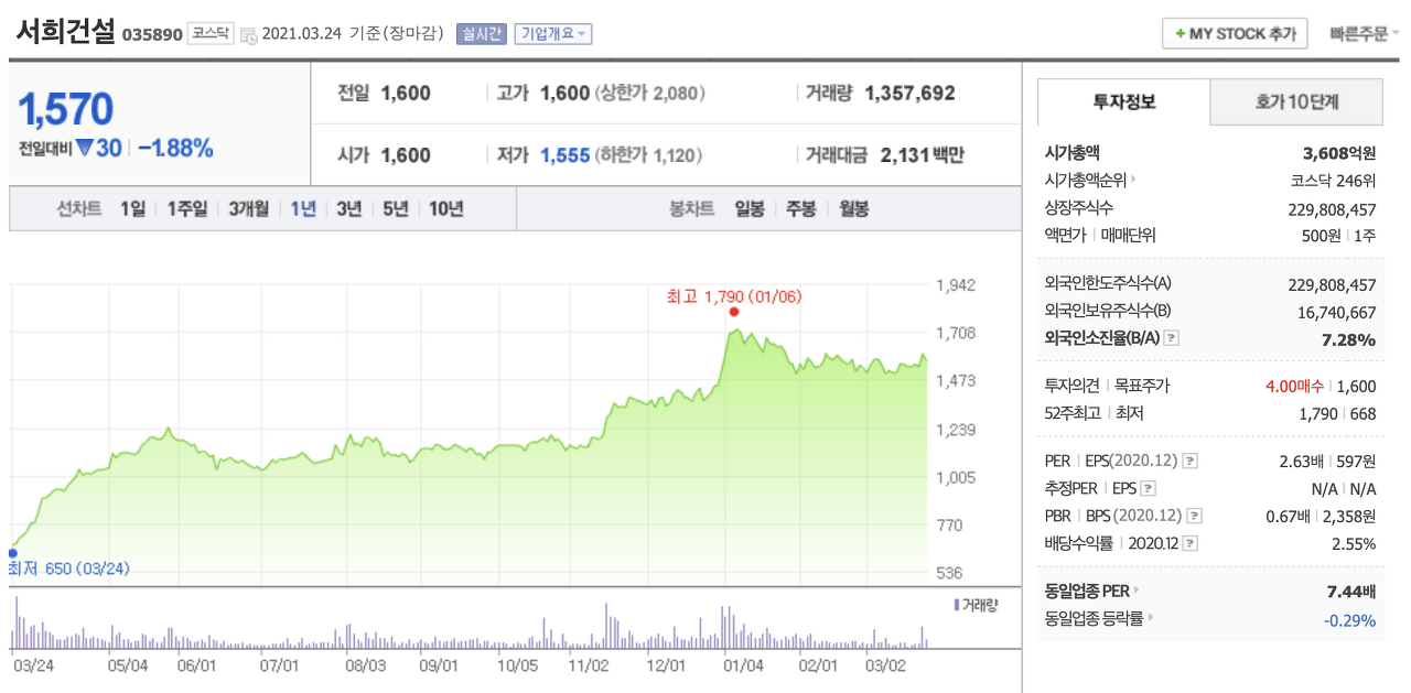 2021년 3월 24일 수요일 종가 기준으로 서희건설은 시가총액 3,608억 원입니다.