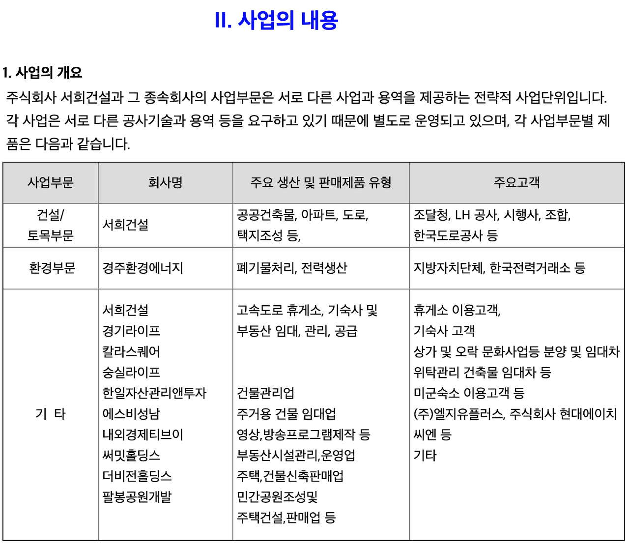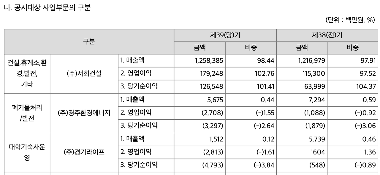 사업부문이 다양해서 모두 정리하지는 않지만, 서희건설의 연결매출 중 서희건설에서 98.44%의 매출이 나오고, 경주환경에너지를 통해서 폐기물 처리, 발전사업이 0.44% 차지합니다.