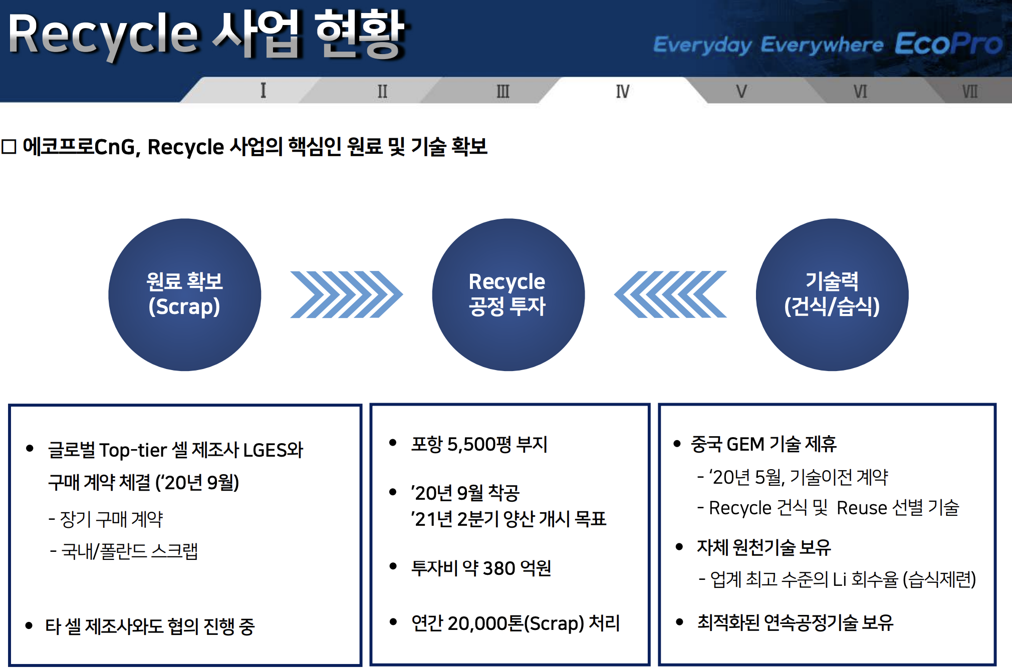 포항에 재활용공정을 투자해서 연간 2만톤의 스크랩을 처리하고, 자체기술과 기술제휴를 통해서